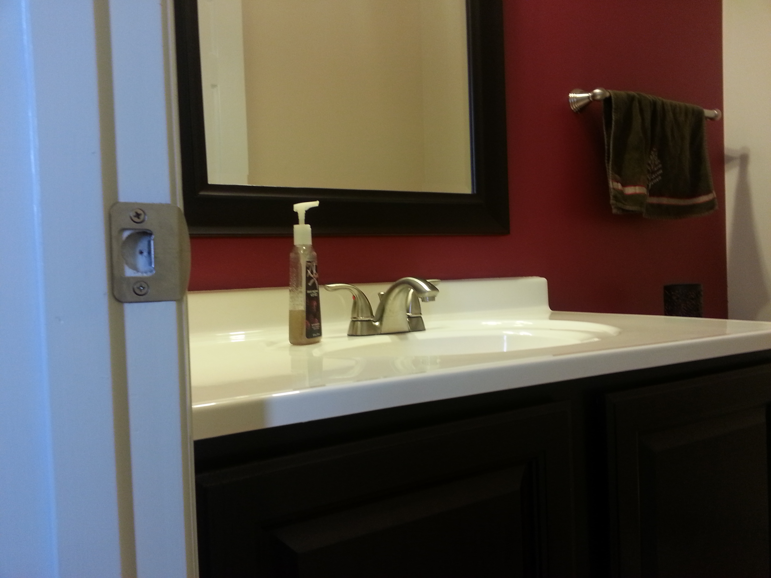 In what probably should have been my first step in this bathroom, once I saw the cabinet come together I pulled out some leftover dark cherry red paint I had from our old house and used it to create an accent wall.
