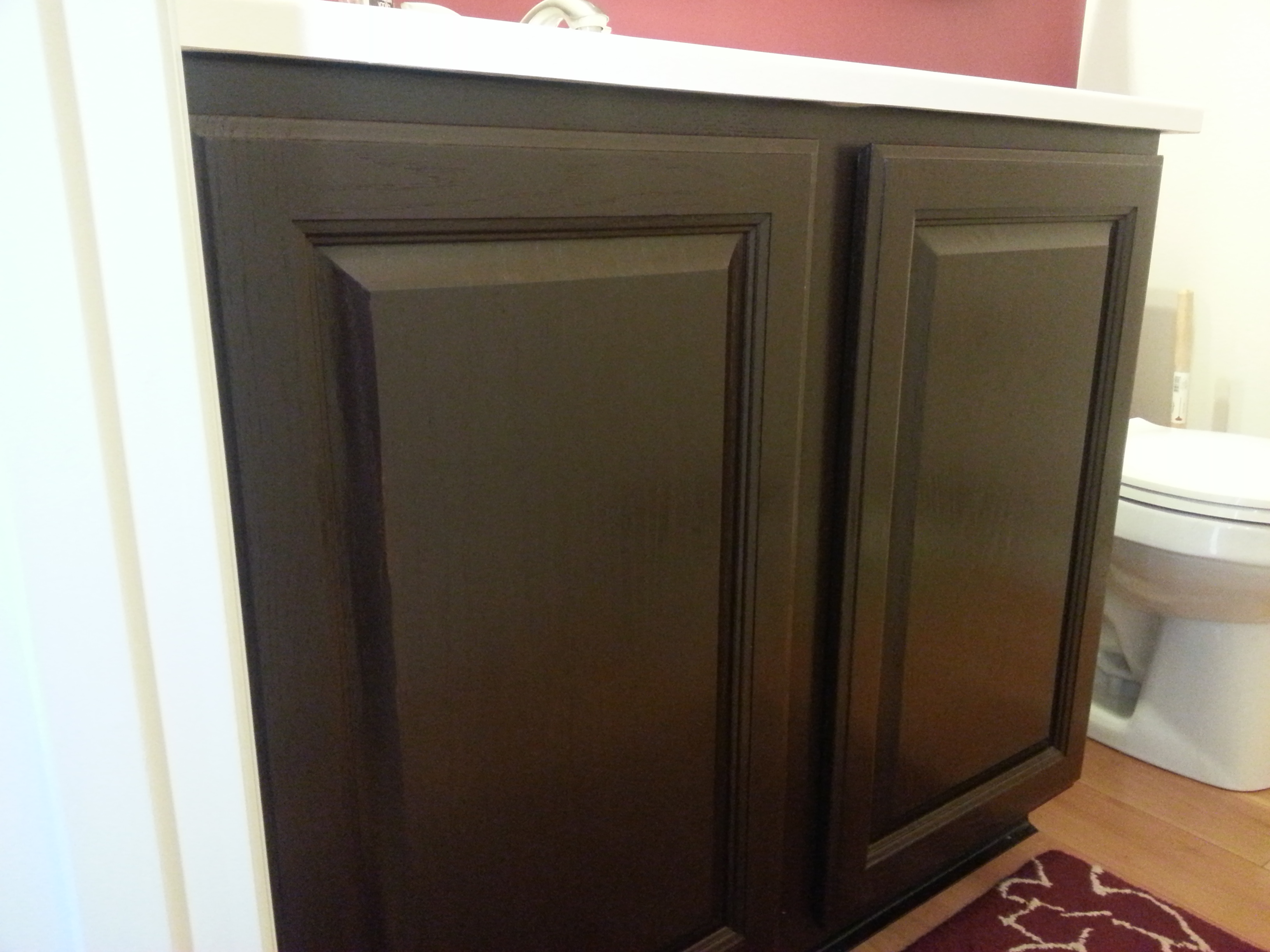 The materials I used were low-end and the gel stain, upon close inspection, does not look as nice as new cabinets would. However, no one but my own mother will probably inspect these while whipping in for a quick restroom break so I think they’ll work for awhile. It is still a vast improvement over what was before and now I don’t feel embarrassed to let people use the half bath when they come over.