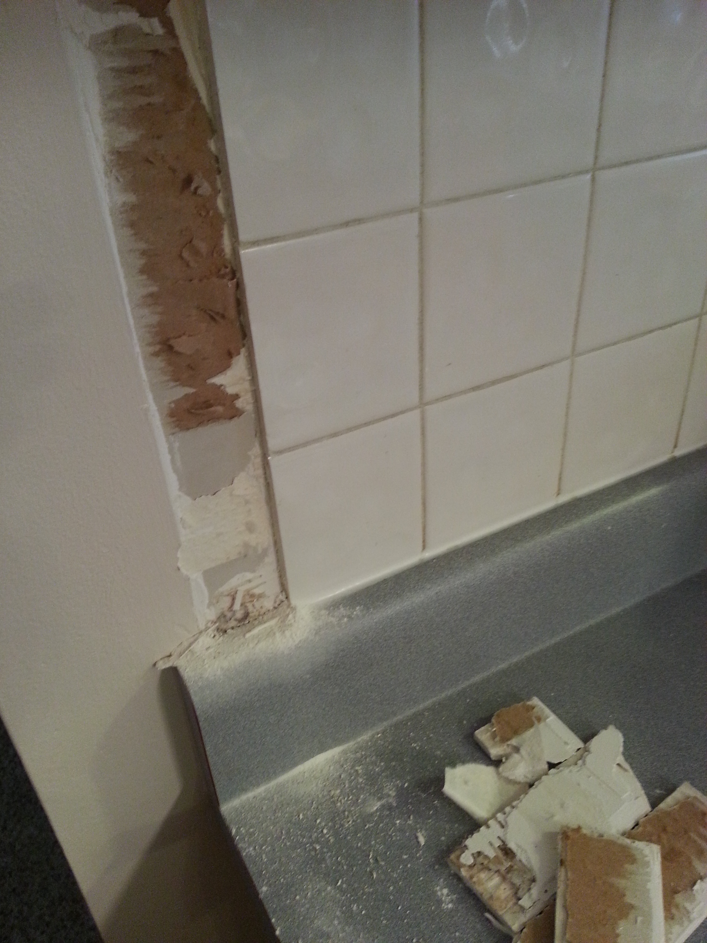 The tile removal effort was ripping the drywall off, so we finally figured out that we could just cut out sections of the drywall between the counter and cabinets since it would have to be replaced anyway due to extensive damage. My darling husband first cut the countertop back down so the future mud and tape line would be beneath the new countertop we were eventually going to get. (Smart. He went to college folks.)