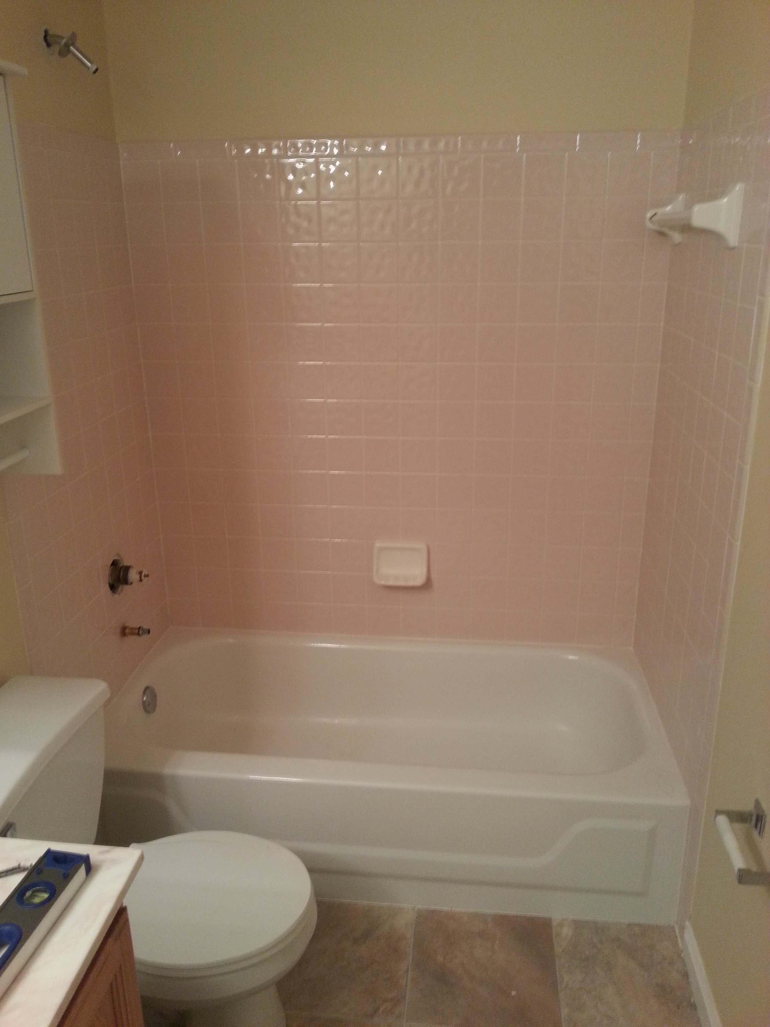 It took several weekends of work but “we” (really, my awesome husband) finally finished tiling the shower surround. The picture turned our terribly. The tile is not at all pink, but different shades of taupe and cream. Remember in my very. first. post. when I said I am not a camera expert? Here’s living proof.