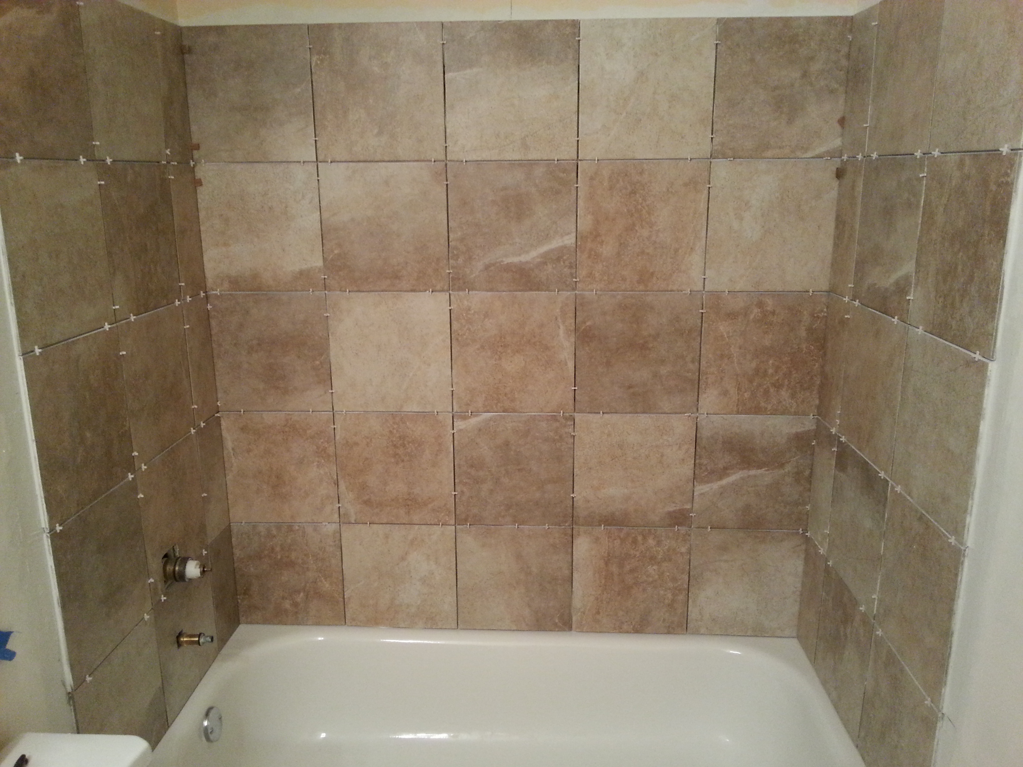 If you think you want to take on a project like this, do your research. We learned a lot from reading articles by home improvement project experts and watching videos. When tiling a shower surround you start at the bottom center, cutting or shaving off the bottom of the tiles as needed to create a level line to build upon as you move up the shower walls. You also want to start in center and work your way out, so your corner pieces are as symmetrical as possible.