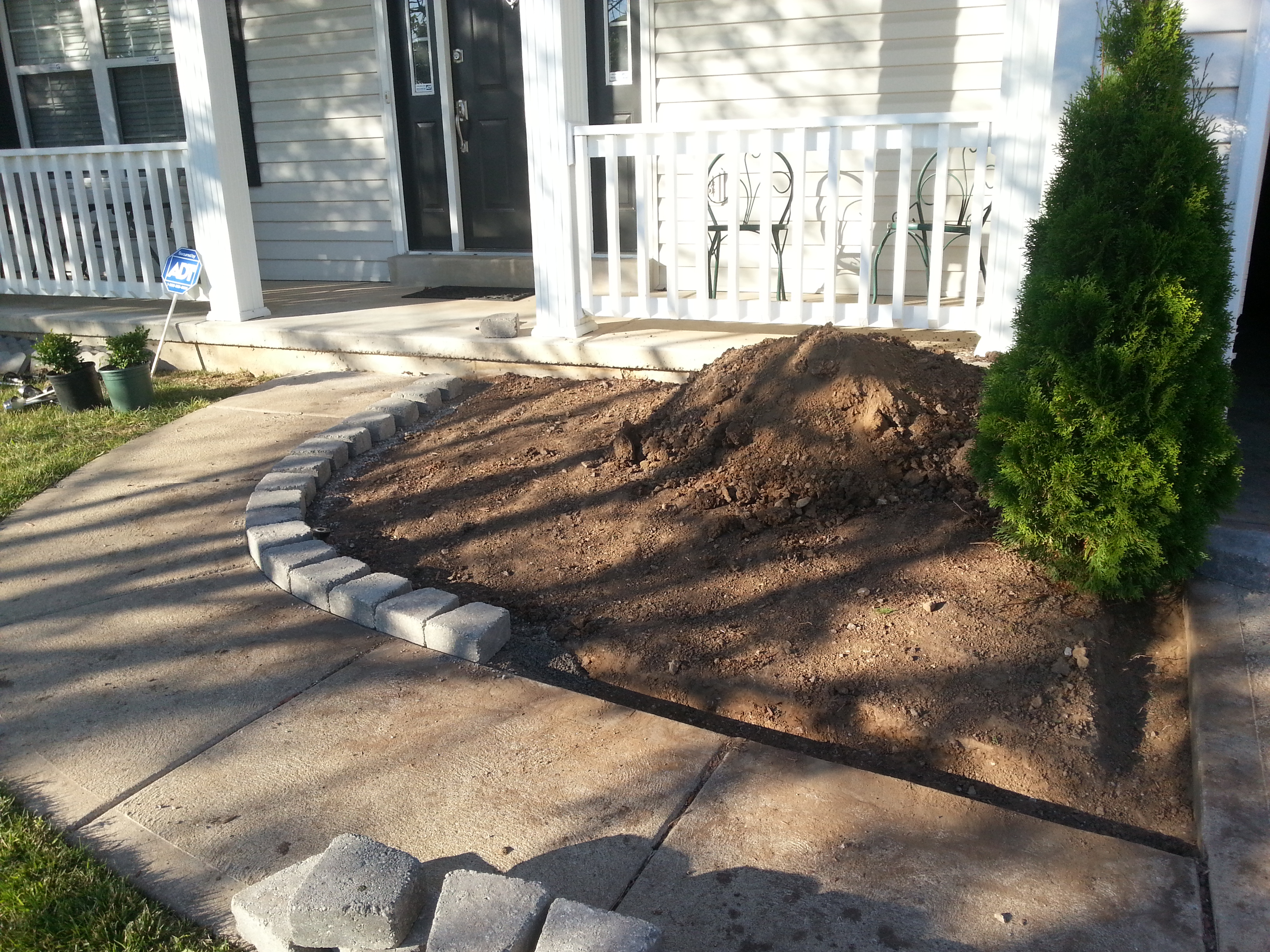 The space curves from the driveway to the front porch. Old stones lined the space, and its a shame we don’t have a picture of them, because they did not curve as perhaps they once did and were a crumbly mess. The whole space looked, well, terrible.